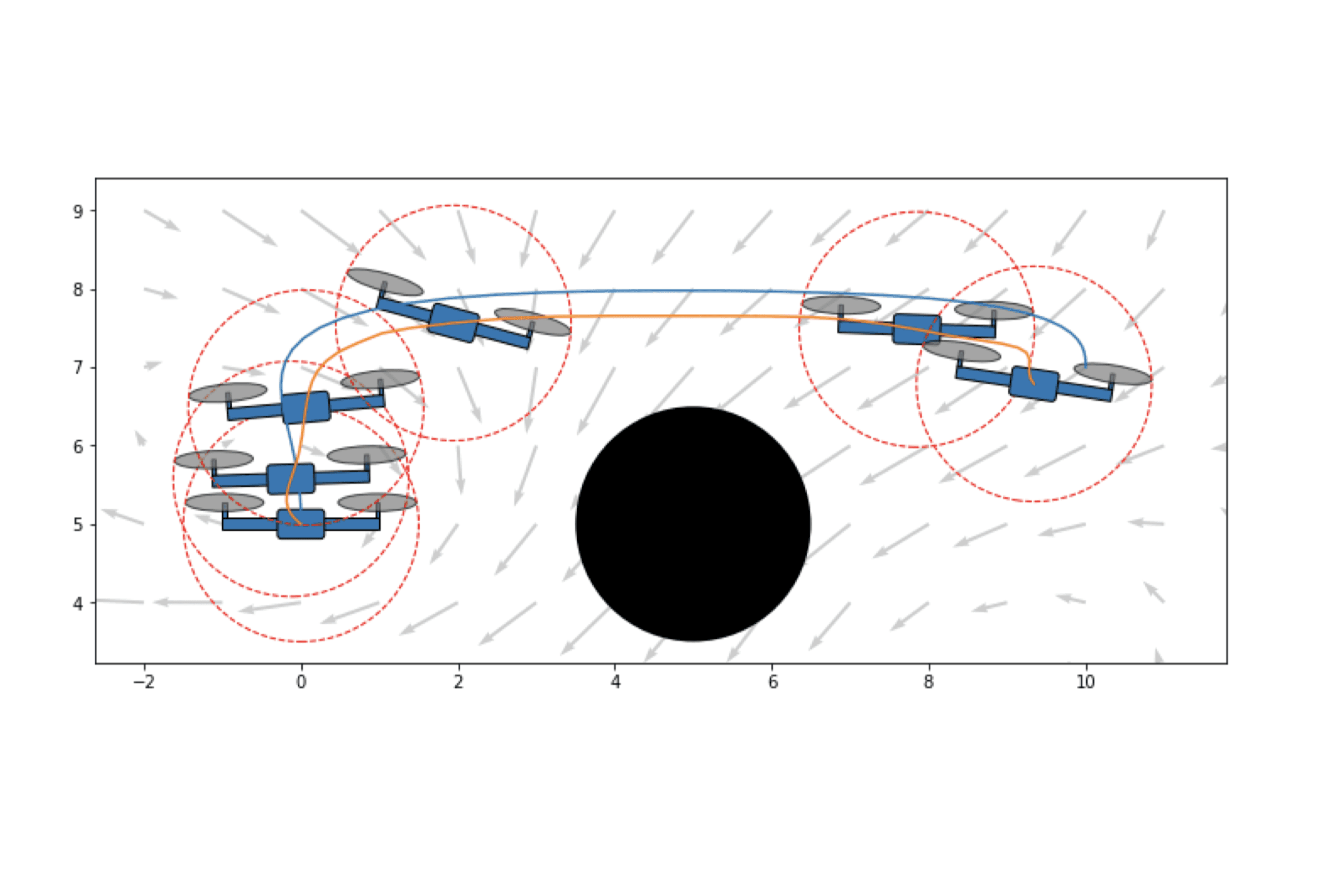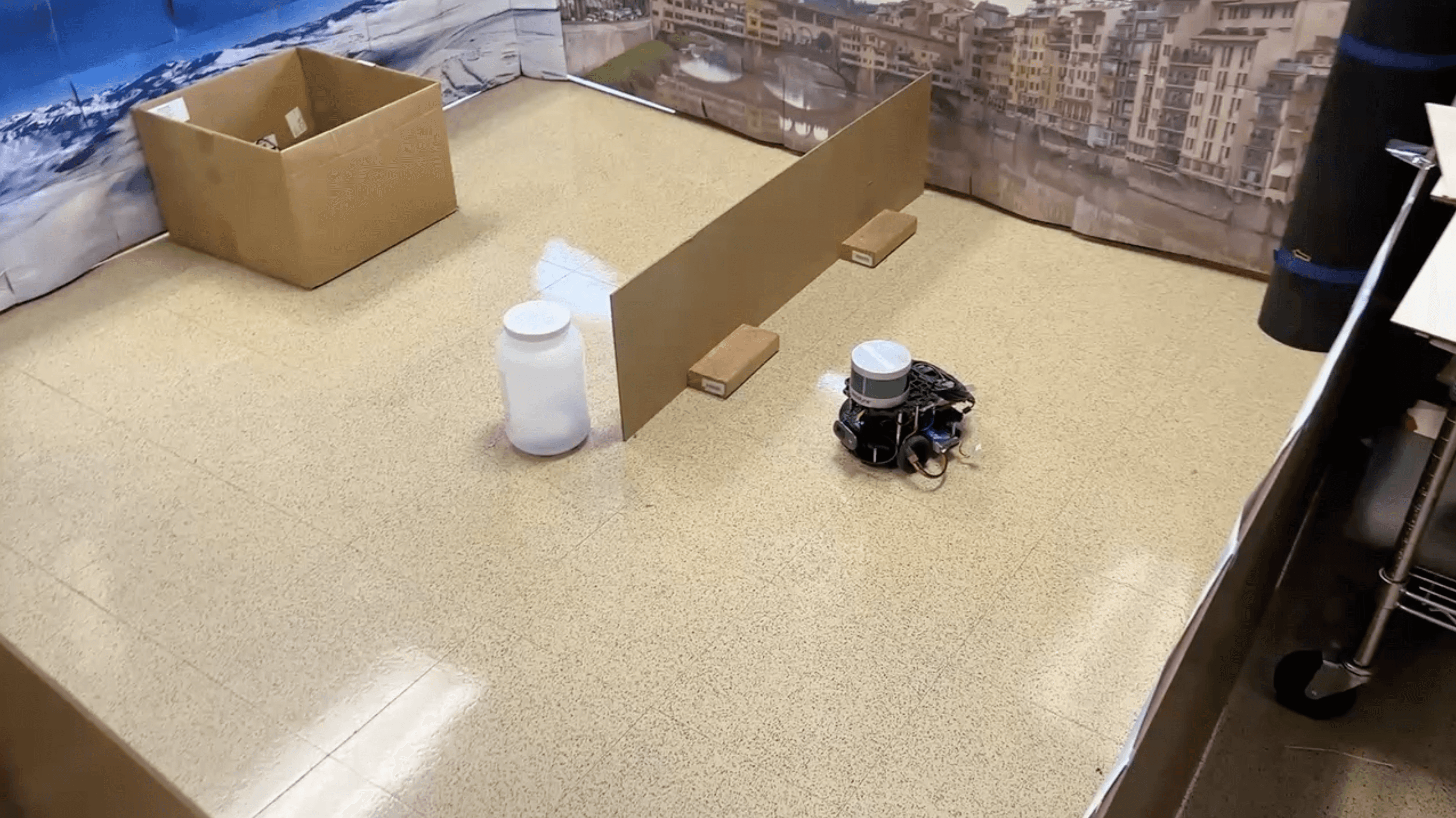 Here, we can see the robot plans its trajectory around obstacles.